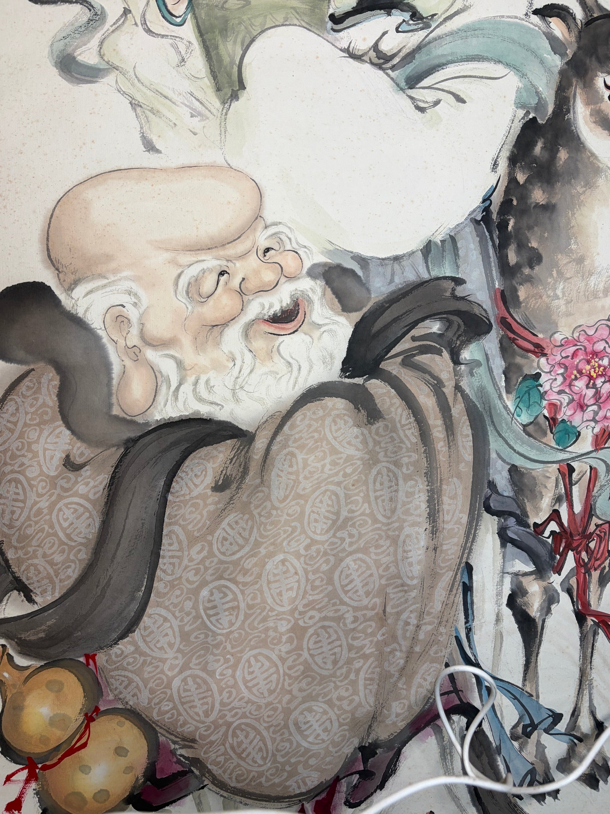This vibrant Chinese hanging scroll, Celebrating Longevity (Zhu Shou Tu), radiates joy and timeless good fortune—ideal for birthdays or auspicious home decor.