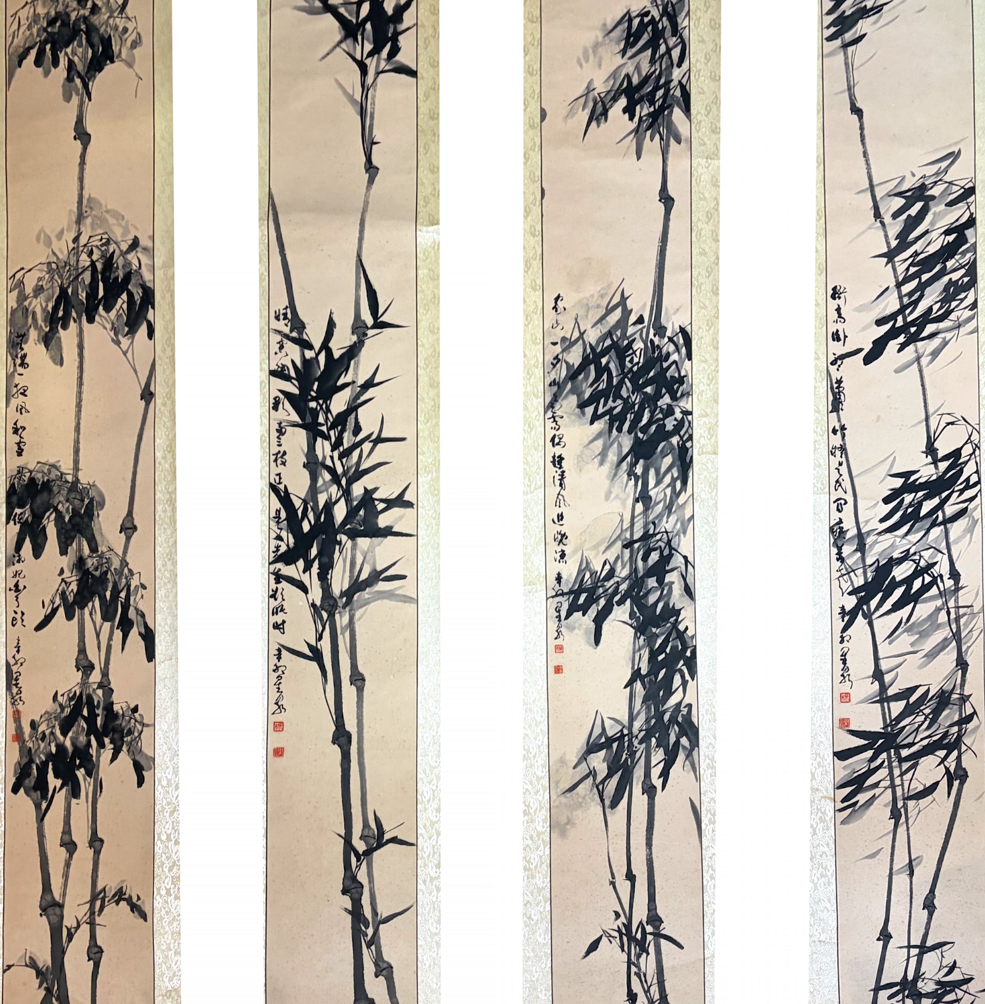 Painted in expressive freehand (xieyi) style with bold, fluid brushstrokes and subtle gradations of ink, each scroll features poetic inscriptions and red seals, mounted on elegant silk borders. Bamboo symbolizes integrity, perseverance, and harmony through all changes—perfect as a complete set for living rooms, studies, hallways, or offices. Ideal for collectors of classical Chinese art, nature lovers, or as an auspicious gift symbolizing adaptability, longevity, and seasonal balance. The four-scroll format creates a harmonious, panoramic display that brings cultured tranquility and positive energy to any space.
